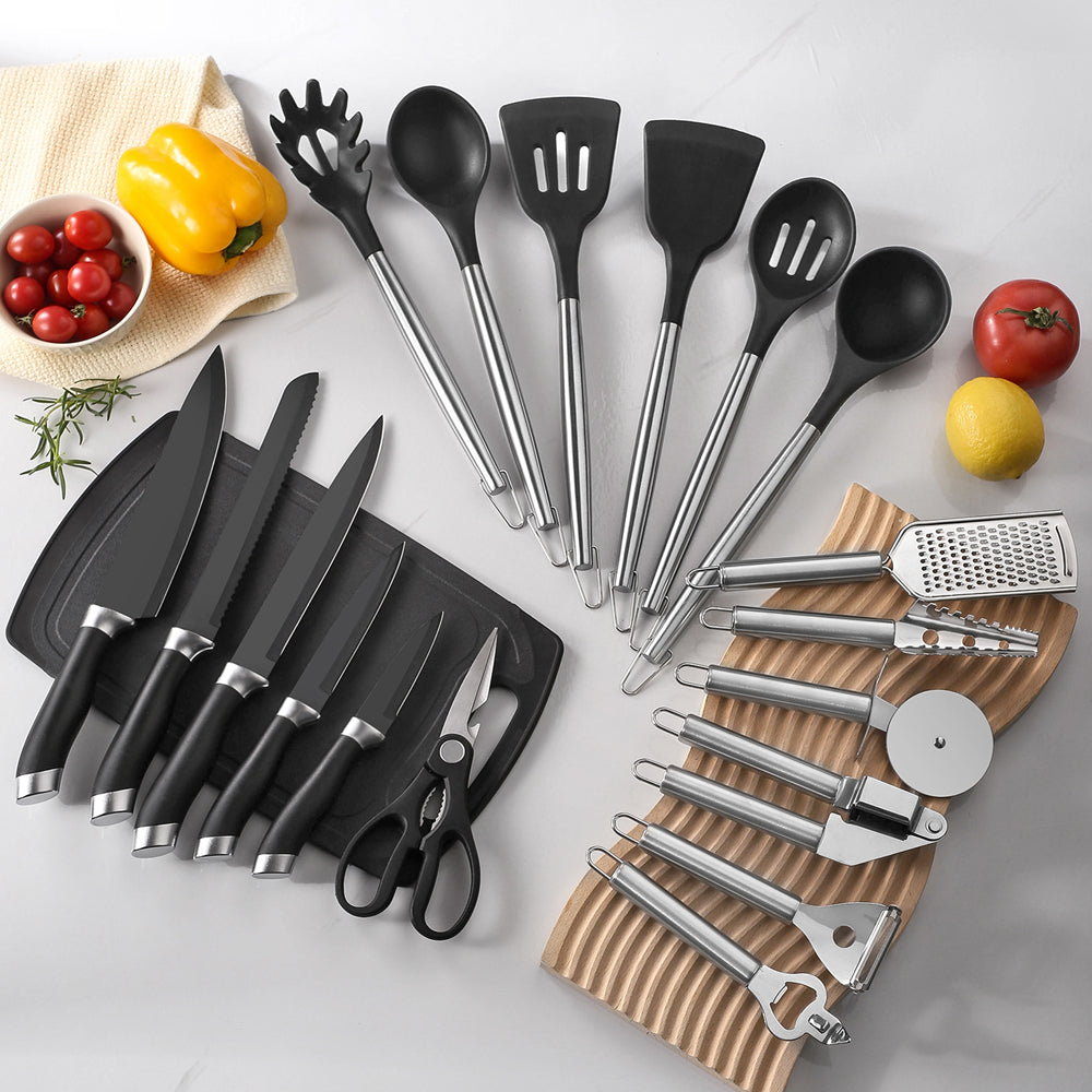 Upgrade your kitchen with this luxury 20-piece black kitchen utensil set. Designed with modern style and durable silicone + stainless steel, this all-in-one collection includes: