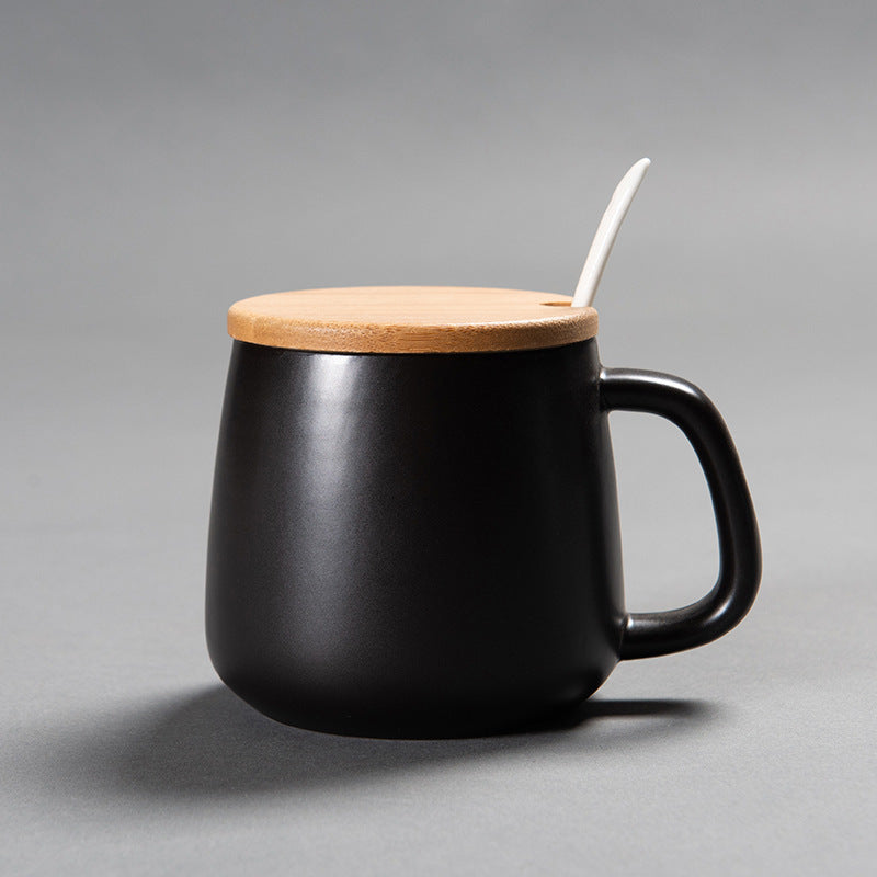 Minimalist ceramic mug with bamboo lid and matching spoon. Matte black or white finish keeps dust out and heat in ideal for home, office, or gifting
