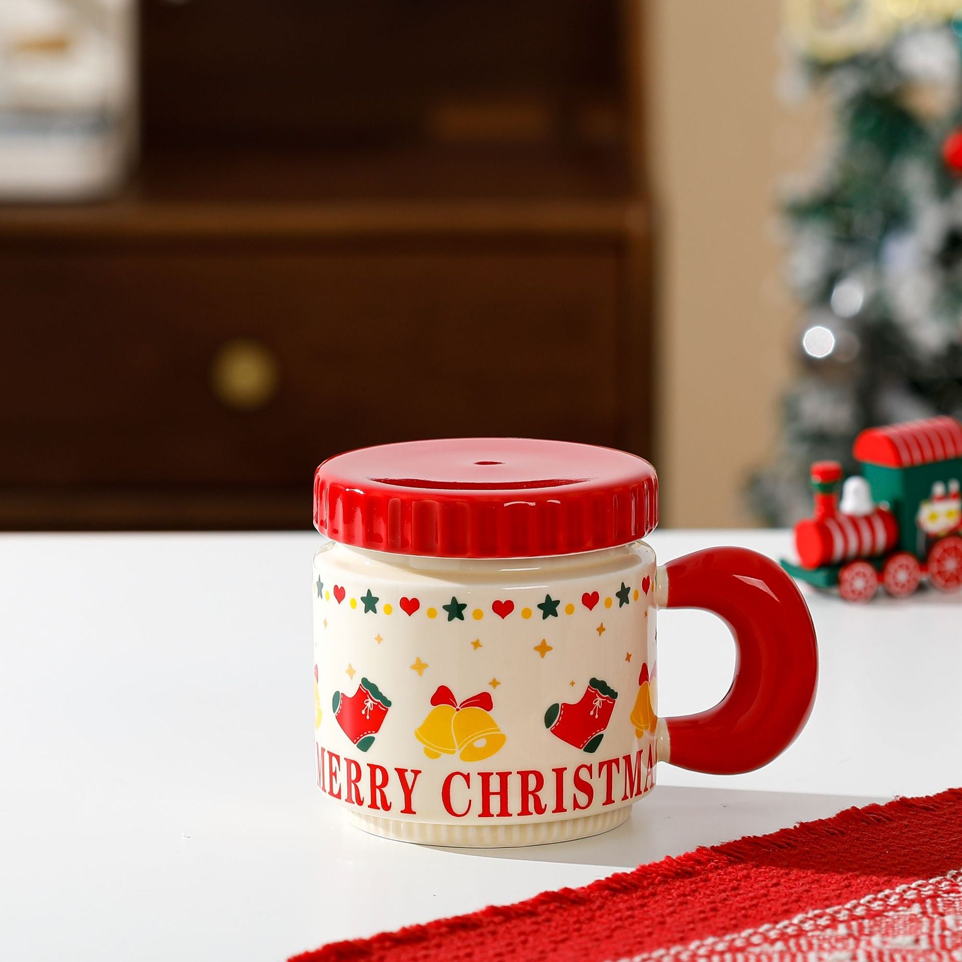 Festive ceramic mug with matching lid and “Merry Christmas” print. Available in red or green—perfect for cocoa, coffee, and holiday gifting.